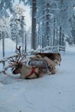 Jest uroczo! Parterowe domki z małymi wieżyczkami pomalowane na czerwono oczapirzone śniegiem wywołują uśmiech na ustach. Tak powinna wyglądać wioska Świętego Mikołaja! Nasze pierwsze kroki kierujemy do Christmas House Shopping zachęceni szyldem "Santa Here!". Skoro tam jest Mikołaj, to idziemy! Budynek okazuje się sklepem, w którym można spotkać się z Mikołajem. Można z nim porozmawiać, np. o naszym wielkim sukcesie na rajdzie Dakar, i zrobić sobie zdjęcie własnym aparatem. Jest jednocześnie robione profesjonalne zdjęcia i nagranie video z wizyty, Otrzymujemy propozycje kupna, jednak odmawiamy z uwagi na cenę. Bardzo mile zaskoczył nas fakt, że nikt nie zrobił kwaśnej miny na odmowę, nie namawiał nas dłużej i nie był natarczywy. Ot, północna gościnność i szacunek. Jakież to różne od zwyczajów południowych! Idziemy zatem do wielkiego iglo, czyli Snowmen World Iglo. Wejście niestety jest płatne, więc nasze kroki kierujemy ku reniferom. Jakież to pocieszne zwierzęta! Te białe z niebieskimi oczami mają tak przygłupawą minę, że jak się na nie patrzy trudno powstrzymać uśmiech. Nie są to duże zwierzęta, ale ich odporność na mróz i siła są imponujące. Można wybrać się na przejażdżkę saniami zaprzęgniętymi przez renifera, jednak cena jak zwykle nas odstrasza. Swój czas poświęcamy na ich fotografowanie.
