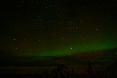 Jesteśmy już daleko za miastem. Jedziemy na południe. Wjeżdżamy do lasu. Podobno można tu spotkać renifery i łosie. Szczególnie te drugie stanowią zagrożenie na drodze. Co ciekawe, jesteśmy na totalnym odludziu, wokół tylko las (jakby park narodowy) a polna, szutrowa droga jest odśnieżona! Docieramy do polany z widokiem na północ. Za nami ściana lasu, przed nami najbardziej rozgwieżdżone niebo jakie kiedykolwiek widzieliśmy. Mnogość gwiazd, ich różnorakie kolory i jaśniejące skupiska zachwycają. Przewodnik mówi, że to najpiękniejsze niebo tej zimy i że mamy wspaniałą pogodę, wręcz idealne warunki - wyż. Singapurczyk robi zdjęcia nieba na bardzo długim czasie naświetlania - ok. 40 sekund. Niestety nic nie widać. Jedziemy dalej, do schroniska Kätkävvaaran Luontokeskus.