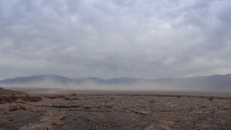 Wracając do głównej drogi z wzniesienia przy kanionie obserwujemy, jak chmura piachu przemierza dolinę. Z początku jedziemy wprost na nią. Na szczęście główna droga powrotna skręca na południowy wschód, dzięki czemu skutecznie omijamy niebezpieczeństwo.
