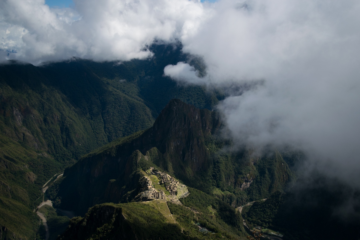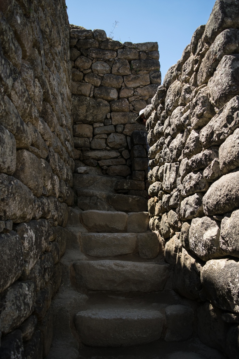 Droga wiedzie niemal cały czas po wąskich, kamiennych schodach. Zostały zaprojektowane na inkaskie małe stópki, więc nasze stopy nie do końca dobrze sobie z nimi radzą tym bardziej, że stopnie są po prostu dość wysokie. Za nami coraz niżej pozostaje miasteczko, ciągle otulone chmurami. Wspinamy się na spokojnie wiedząc, że chmury rozstępują się koło godziny 09:30 i jest to najlepszy czas na pobyt na szczycie.