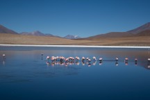 Przy kolejnej, położonej dość blisko, Laguna Hedionda (co znaczy "śmierdząca" - nie bez przyczyny) jemy obiad. Ponownie podziwiamy zdolności kucharskie naszego kierowcy, który dostarcza nam smacznych i pożywnych posiłków w tych polowych warunkach. Ta laguna jest zdecydowanie inna - ma kolor turkusowo-miętowy. Jej brzegi również są białe, jednak nie ma tu traw. Tutejsza gromada flamingów jest zdecydowanie większa - może to jest przyczyną nieprzyjemnego zapachu? Nie, to okoliczne złoża siarki, które cuchną zgniłymi jajami.