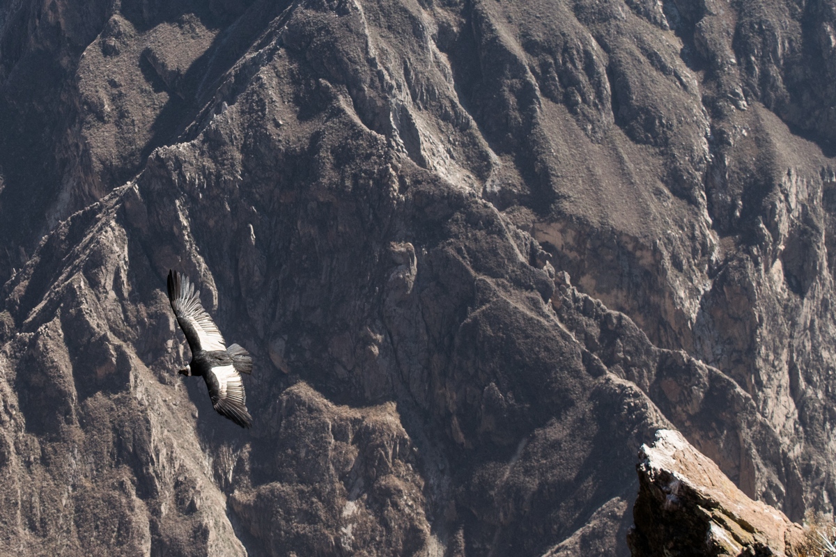Dojeżdżamy na Mirador Cruz del Cóndor i zajmujemy całkiem dobre miejsca przy barierce na górnym tarasie. Sama słynna skała jest już oblężona, ale nasza pozycja również jest bardzo dobra. Mija niespełna 20min, kiedy nadciągają pierwsze ptaki. Majestatycznie szybują nad naszymi głowami. Starsza podchodzą do ludzi z rezerwą - są bardziej zajęte swoimi sprawami. Młodsze, upierzone na brązowo, są zuchwałe, chętne do interakcji z człowiekiem. Niektóre z nich przelatują tuz nad głowami osób siedzących na skale. w tych chwilach cieszymy się, że stoimy przy naszej barierce. Czas mija, a ptaków nie ubywa, jedne odlatują, inne przylatują. Spektakl trwa i trwa. Po około 40 minutach żaden nory kondor nie pojawia się w kanionie, więc idziemy na dolne piętro podziwiać widoki. Gdy mijamy słynna skalę z pamiątkową tabliczką, naszym oczom ukazują się kolejne ptaki. A zatem mamy bis spektaklu! Bo tak należy nazwać to, co kondory robią nad naszymi głowami - to prawdziwy spektakl natury. Bis trwa drugie tyle co pierwsza część. A może to nie bis, tylko druga połowa przedstawienia? W każdym razie jesteśmy zachwyceni i zszokowani, bo spodziewaliśmy się maksymalnie kilku kondorów, a tu otrzymujemy półtora-godziny pokaz.